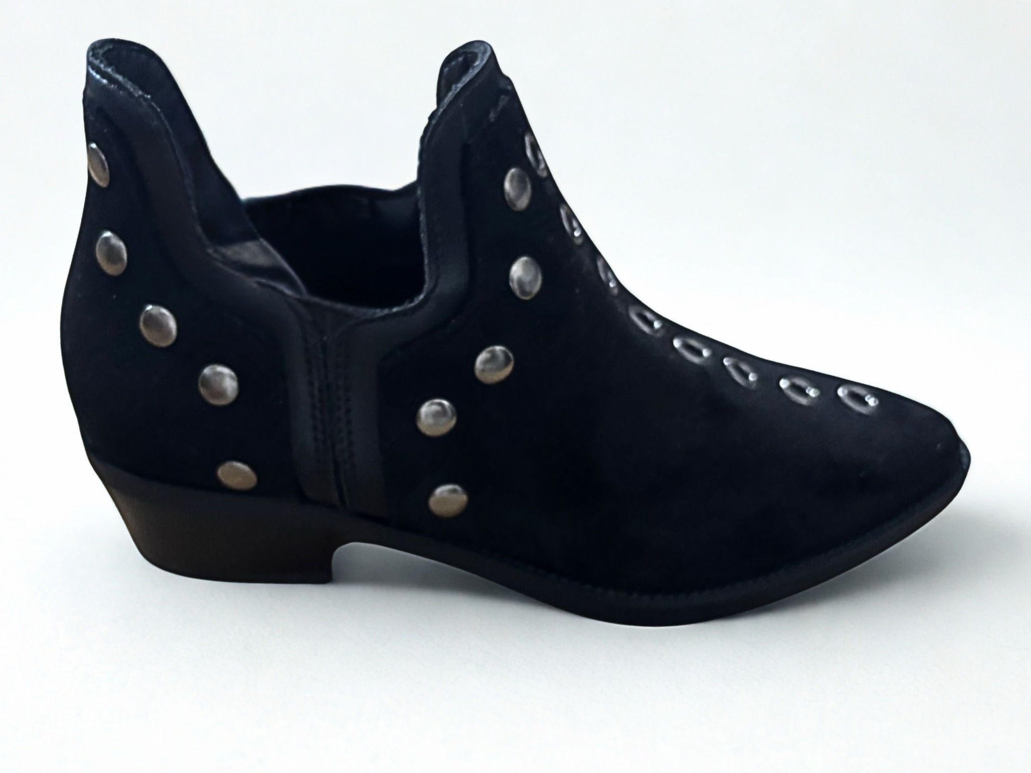 Botines en ante negro para mujer con tachuelas metálicas y diseño western. Perfectos para combinar con jeans o vestidos y realzar cualquier look de temporada.
