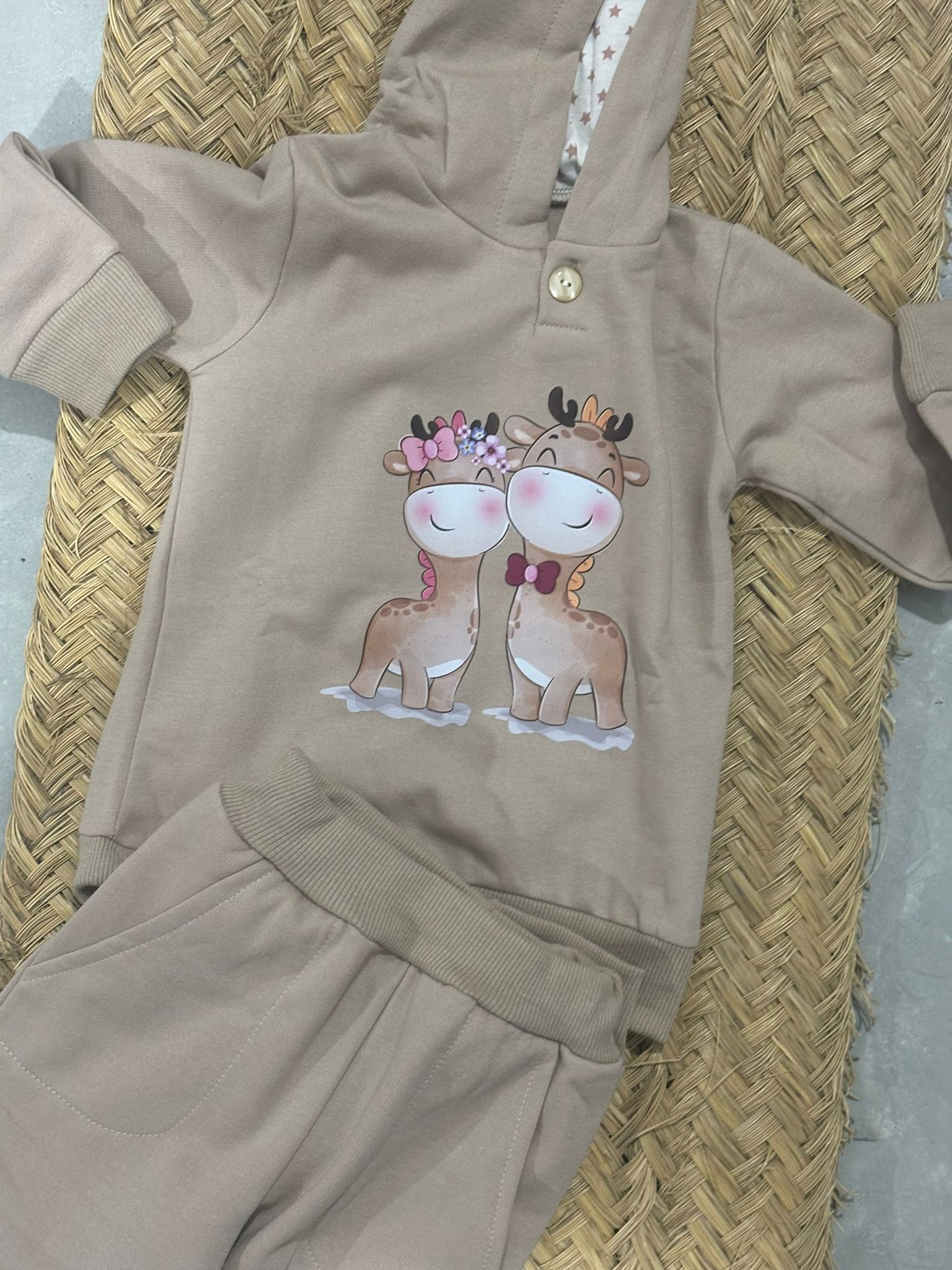 Conjunto de chándal para tu peque. Con un precioso dibujo de unas jirafas. El pantalón, sencillo y elástico, completa un look práctico y encantador para el día a día.