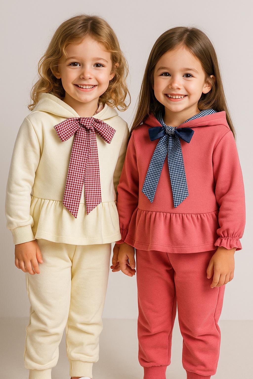 Viste a tu peque con este adorable conjunto de chándal. Sudadera peplum con un gran lazo de cuadros vichy y pantalón jogger a juego.